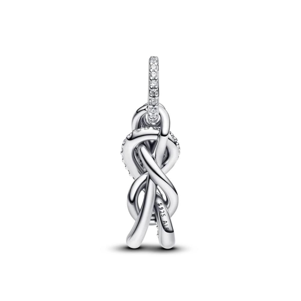 Indossa un promemoria di amore eterno con il charm pendente Nodo infinito con pavé in Argento Sterling 925. Con pietre luminose e l'incisione "Amore Infinito", simboleggia l'amore che conquista tutto.