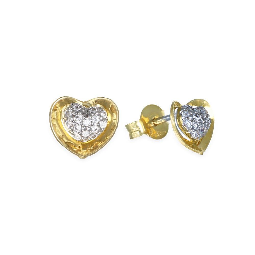 Orecchini in oro giallo 750°/°° decorati con cubic bianca taglio brillante. Peso: 1,7 gr. Alti 8 mm e larghi 8,8 mm.