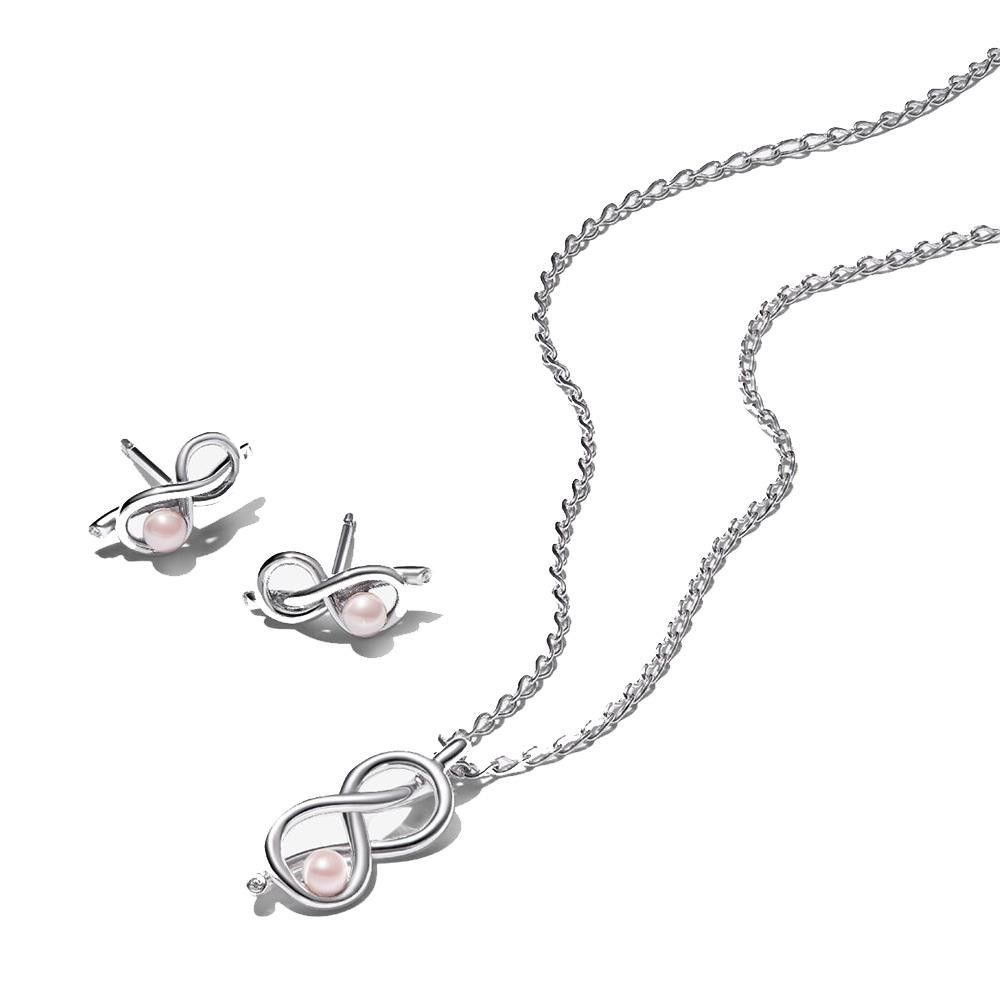 Simbolo senza tempo di amore e legami, questo splendido set di gioielli abbina delicate perle rosa ad accenti scintillanti, inseriti in un elegante nodo dell'infinito, perfetto per aggiungere sentimento ed eleganza.